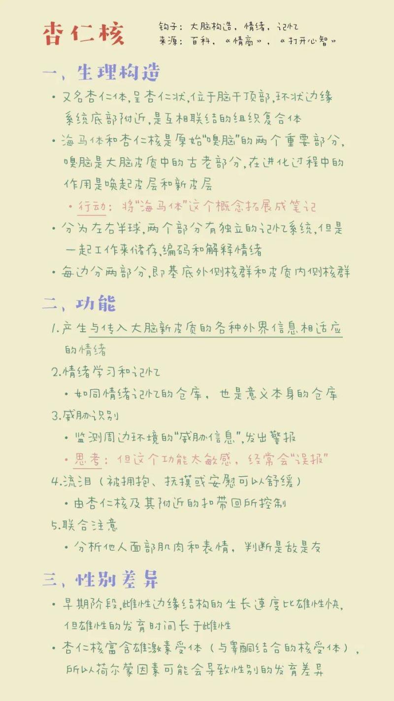 然后是笔记的信息主体,我们将收集到的信息放在一起后,要去思考如何以自己的框架将它们归纳到一起。比如这篇笔记里,我就将杏仁核的特点归纳成了生理构造、功能以及性别差异,然后再相应的知识分配到里面,在这个过程中,还要尽量用自己的语言重新讲述作者的内容。
