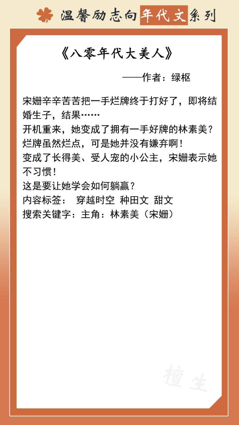 简评:女主宋姗逃离极度重男轻女的原生家庭后,正展望新生活,却意外穿越成了自己认识的姑娘林素美年少时期。这位姑娘家庭美满,父母兄长们都疼爱她,自己也貌美如花,从小就是村里令人羡慕的存在,只是为了爱情,把一手好牌打烂。女主变成她后,满怀愧疚,觉得自己抢了别人的人生,盼着能换回来,然而她左等右等没等到原主灵魂回归,自知回去无望后,女主决定珍惜眼前的生活和家人,重拾学业考大学,并找出“林素美”当年被冤枉的真相。男主谢长渝是个胆大心细,目光敏锐的青年,抓住机遇做生意,攒下丰厚的身家开公司,和女主的感情循序渐进,双向奔赴。