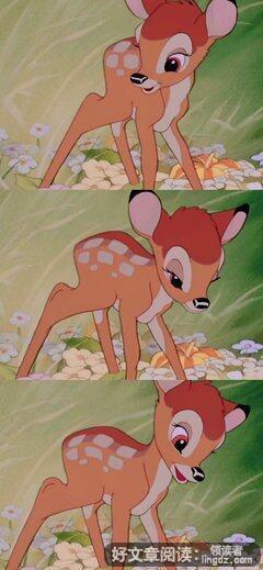 想起幼年时斑比成长的事件和我现在的习惯就感到脸红。我生活中许多事靠大人包办。有时,在家吃饭要奶奶一口口地喂,晚自习结束,书包要爷爷一点点地整理,放学要大人接送。读了这本书后,我决心学会生活,自己动手吃饭,整理书包,自己安排晚自修。