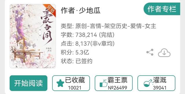 女主白手起家,做丝绸生意,写的很专业。我还蛮喜欢少地瓜大大的,这本的类型也是我喜欢的,不过就很奇怪,这一本相比于大大其他的小说数据一般。