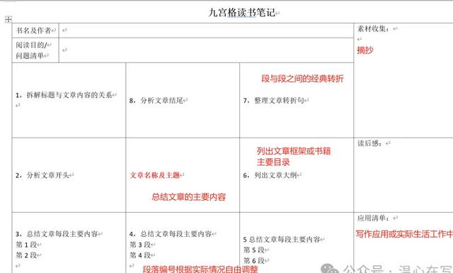原指选定一个主题,通过不断提问的方式收集素材完成写作。这里我稍微改动了一下,用九宫格的方式写阅读笔记也非常好用。