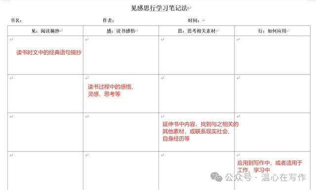 4,行:学习文中值得学习的地方;适合自己的可以应用到学习工作中;好的素材可以应用到写作中去。
