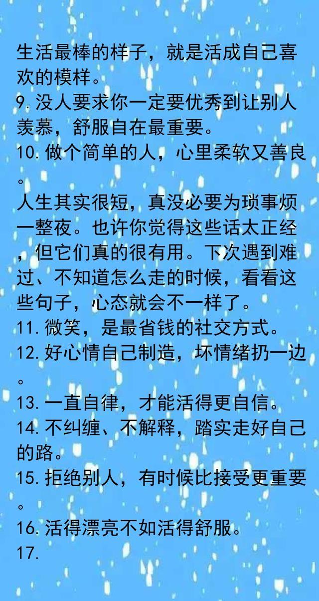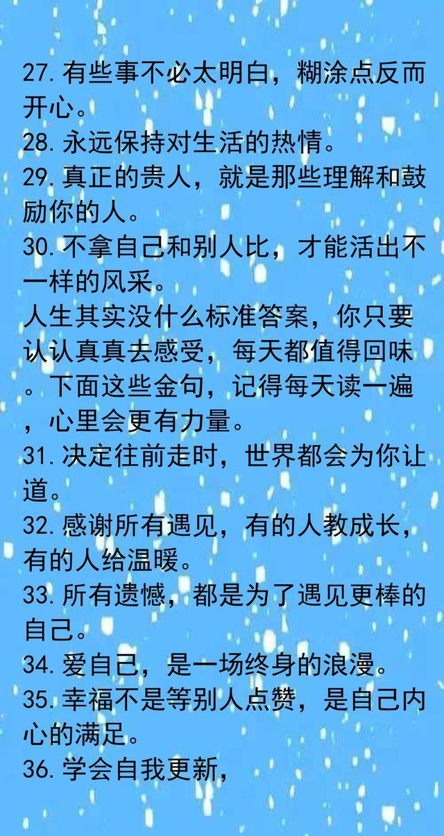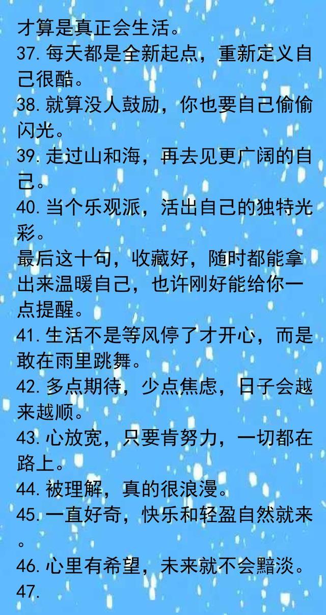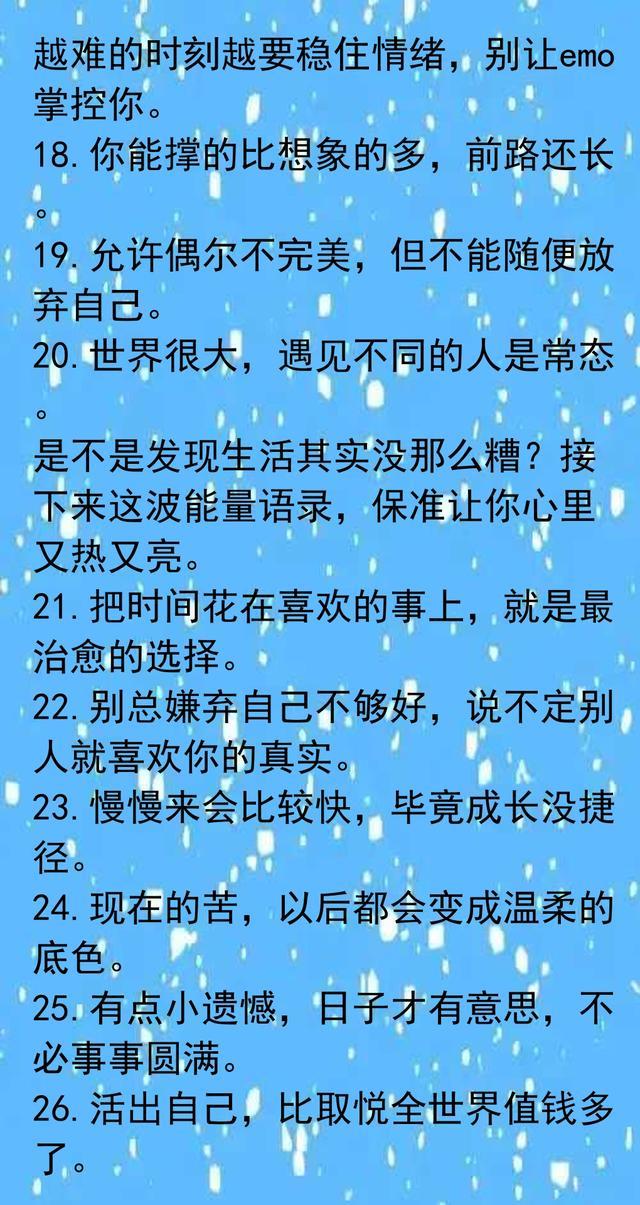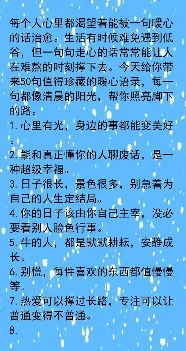 每个人都需要来自心底的鼓励。金句里的温暖和力量,其实就是日常生活的慰藉,也是自我调节的钥匙。我们时常被琐事烦扰,偶尔丧气,但那些简单又真诚的话语,总能让人缓一口气。选择跟懂自己的人分享闲聊,比起刻意赢得别人的认可,反而自在很多。专注喜欢的事物,让自己慢慢成长,不必急着跟时间赛跑。自律和自信,其实就是每一天的小积累。学会拒绝和放下,不纠结于难题,反而更容易把握属于自己的节奏。好心情是自己创造出来的,不需要外人来定义幸福。允许不完美,生活本就有遗憾,但真实和坦率最有味道。比起活得漂亮,活得舒服才更重要。朋友的鼓励、理解,是人生路上的贵人。无论遇到什么困难,都能沉住气,慢慢向前。世界很大,遇到不同的人和事,是生活的常态,也是成长的一部分。每天都有新的开始,哪怕没有人鼓励,也要默默努力,悄悄发光。人生没有标准答案,只要把时间花在自己喜欢的事情上,就是最好的选择。越努力越幸运,不用为过去遗憾,因为未来总有惊喜在等着。快乐的本质,不是拥有更多,而是计较更少。只要内心有希望,未来就会明亮。那些温柔的话语,不只是鸡汤,更是日常生活里可以用来点亮自我的小工具。收藏起来,每当迷茫或低落时看看,总能带来一点力量。