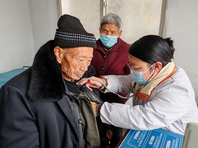 (庄小妹医生在听老年患者心肺情况)