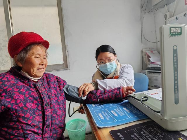 (庄小妹医生在为老年患者监测血压)