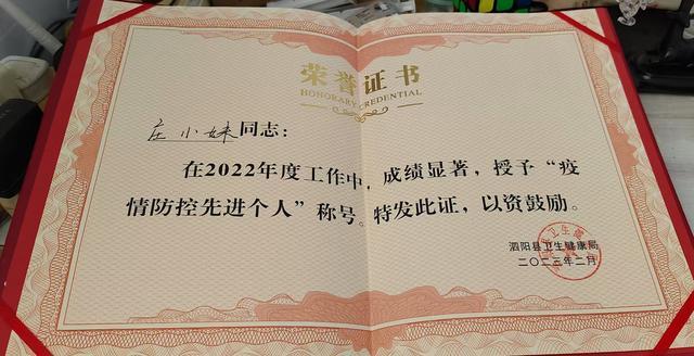 (庄小妹被县卫健局表彰为疫情防控工作先进个人)