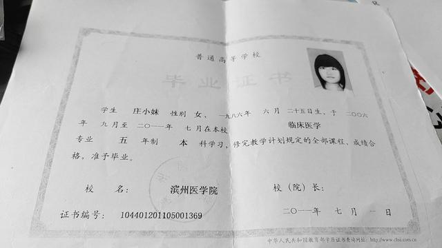 (庄小妹滨州医学院毕业证书)