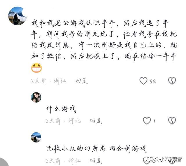 和老公游戏认识半年,然后退了半年。期间号给朋友玩了,他看我号在线就给我发消息,有一次刚好是我自己上的,就加了微信,然后就谈上了,现在已经结婚了。