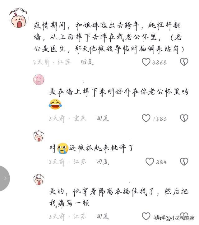 疫情期间和姐妹逃出去跨年,爬栏杆翻墙从上面掉下去,摔在老公怀里,老公是医生,那天他刚好被领导临时抽调出来站岗。