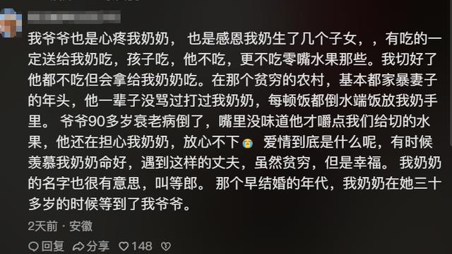 在奶奶的生日宴后,余女士将爷爷的告白视频发布在自己社交账号上,没想到引发了很多网友关注。许多人被“老辈子”的情话感动流泪,“用最淳朴的文字叙说着最真挚的情感,这是现代多少人羡慕的朴实纯粹的爱情。大大方方表达爱,这样的家庭一定美满幸福!”