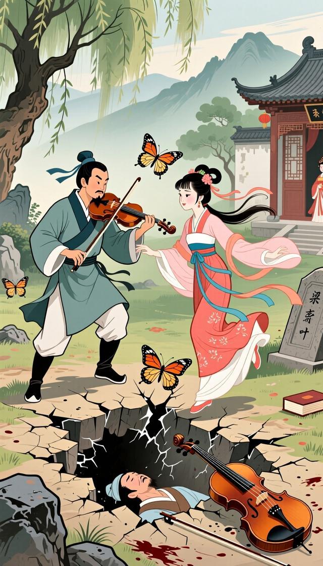 祝英台在婚礼途中得知梁山伯去世的消息,悲痛万分,赶往梁墓前。传说她跳入梁山伯的坟墓,坟墓突然裂开,两人化作一对蝴蝶,永远相依相伴,象征着忠贞不渝的爱情。