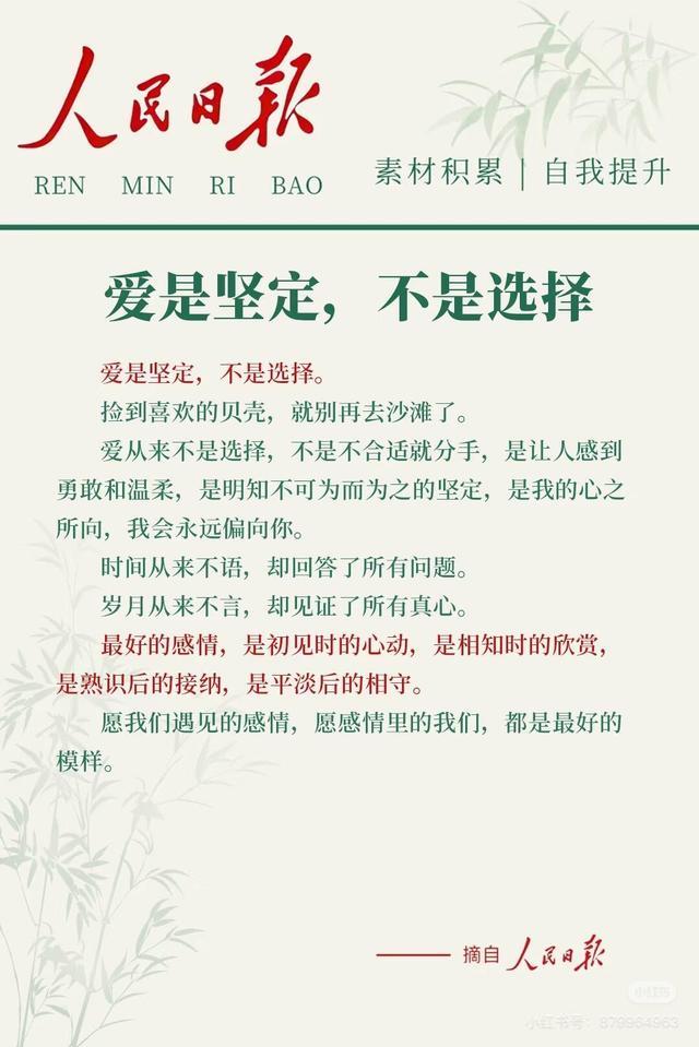 前几天整理手机相册,刷到朋友转发的人民日报素材里关于爱情的几段话,盯着屏幕看了好久,突然就红了眼眶。