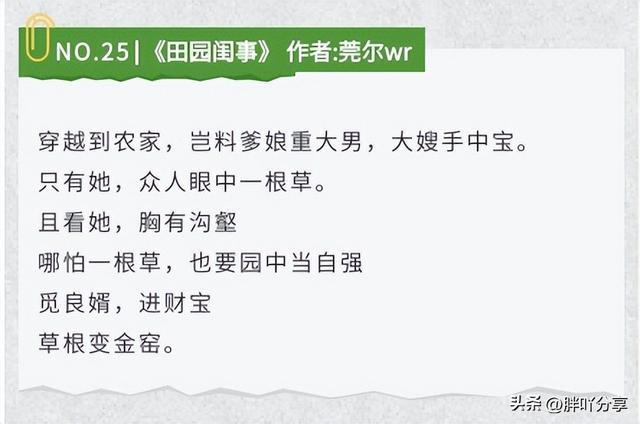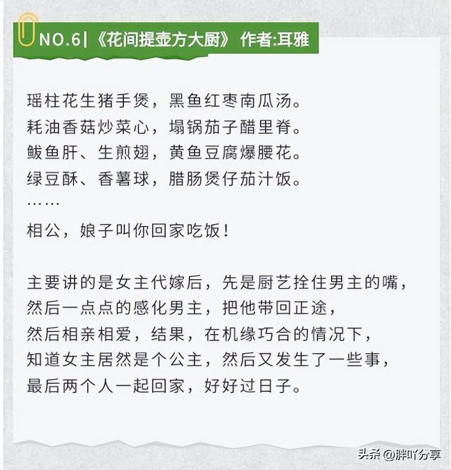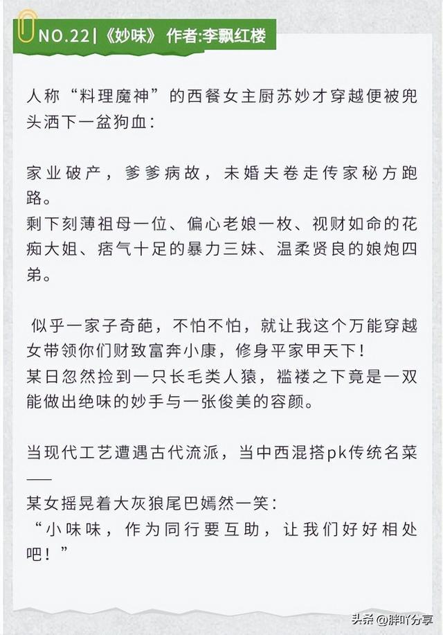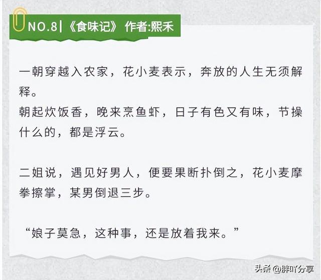 温馨治愈种田文。现代厨神穿越成极品胖农妇,用高超厨艺改造形象、发家致富,挽回儿子依赖与丈夫爱情。故事平淡真实,聚焦家常美食与朴素亲情,是典型的暖心种田文。