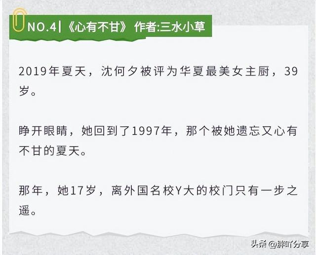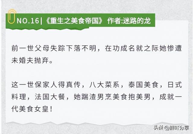 无CP重生美食励志文。顶级女厨师重生回17岁,弥补遗憾,阻止家庭悲剧,并与自己厌恶的厨艺和解。章节以菜名命名,从饺子到老汤,从中餐到西餐,描写专业细致,画面感极强。内核是关于梦想、家庭与自我和解的深刻故事。