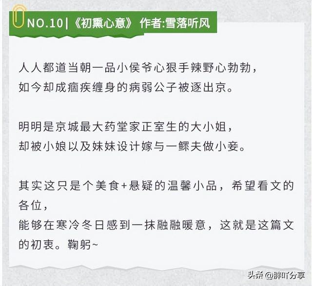 古言美食悬疑小品。被贬病弱侯爷与逃婚厨娘在江南相识,以美食为引,卷入一段悬疑往事。前半部分江南美食描写细腻动人,后半部分悬疑线展开,整体节奏舒缓,感情细水长流,是兼具烟火气与故事性的佳作。