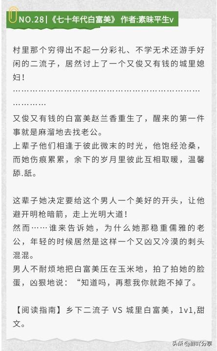 重生年代美食甜宠文。上辈子遗憾错过的女主,重生后主动下乡找到落魄的男主,用美食与陪伴助他避开歧途,改变命运。感情线甜蜜炽热,男主荷尔蒙爆棚。剧情温馨治愈,美食诱人,金手指爽文。