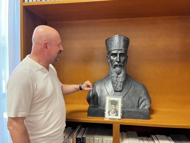7月4日,在意大利马切拉塔,利玛窦国际基金会主席达里奥·格兰多尼(中文名:高达理)介绍利玛窦雕像。新华社记者李彦南摄