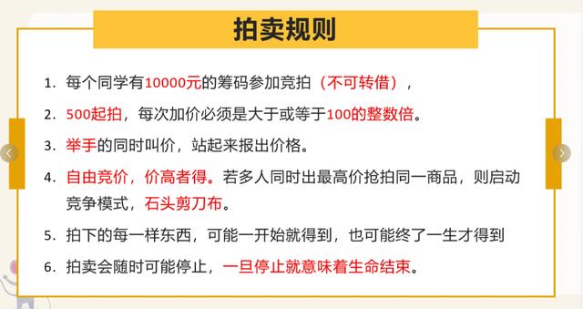 老师在课前说:“我们不做金钱交易,只拍卖人生的可能性。你的出价,是内心的选择;你拍下的,是未来的自己。”同学们踊跃参与,课堂气氛很热烈,但也有女生因为竞拍爱情而受到同学们的议论。