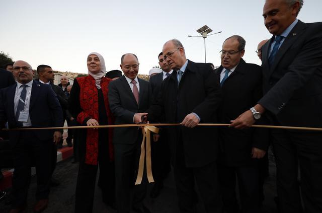 11月26日,在约旦河西岸中部城市拉姆安拉,嘉宾共同为中方援建的北京路延长项目竣工剪彩。新华社发(艾曼·诺巴尼摄)