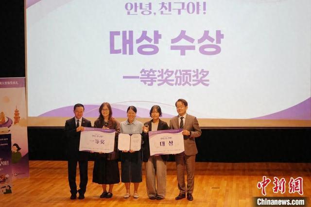 在2025年举办的“你好,朋友!”中韩青年短视频大赛颁奖典礼上,来自中国的蒋雯露与来自韩国的金松恩凭借短视频《路过灿烂,到达平凡》获得一等奖。在舞台上,中国驻韩国大使戴兵和韩国《中央日报》代表理事朴长羲为获奖团队颁奖,两人微笑着接过纪念奖牌和证书。