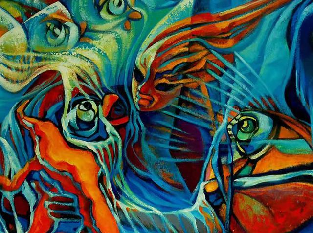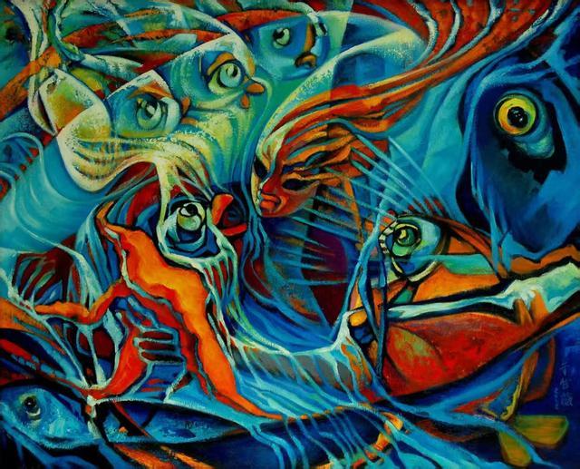 《朋友》这幅油画创作作品紧扣人与自然和谐共生的主题。画中众多鱼的形象相互交织,鱼作为自然生物的代表,它们之间看似亲密无间的互动,象征着自然界生物之间的友好关系。同时,这种关系也影射着人类与自然应有的相处模式——相互依存、和谐共处。画家通过鱼的形象传达出一种呼吁,希望人类能够珍视自然、尊重自然生物,将自然视为朋友,而非征服和掠夺的对象。