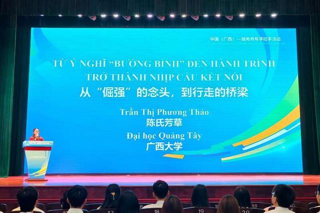 从东兴口岸入境的那一刻起,越南留学生陈氏芳草便开启了“用两种语言书写人生”的旅程。作为广西大学公共管理学院在读博士生,她用幽默生动的语言,分享了自己在中国求学、生活、交流的点滴经历:从听不懂“老铁”“集美”等网络用语,到熟练融入中国校园生活;从单纯的知识学习,到主动成为中越文化“双向翻译官”,向越南朋友讲述中国发展,向中国朋友介绍越南文化。“未来属于那些会跨越边界、搭建桥梁的人,而我愿做那个行走在桥上的人。”陈氏芳草真挚的话语赢得阵阵掌声。