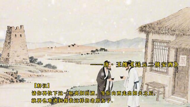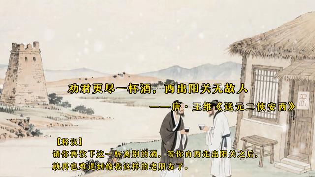 ·是王维的:劝君更尽一杯酒,西出阳关无故人。--唐·高适《别董大》。【释议】:劝君更尽一杯酒,西出阳关无故人。
