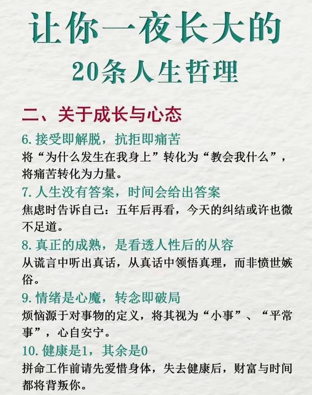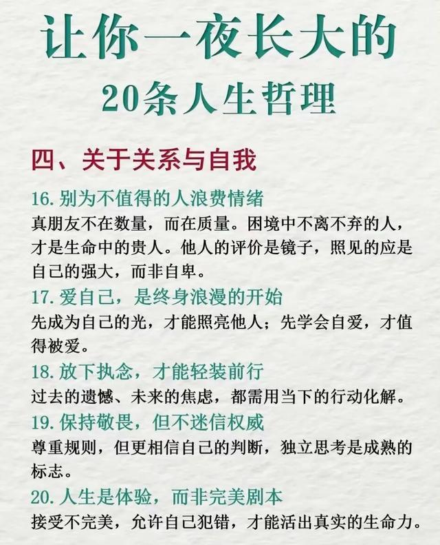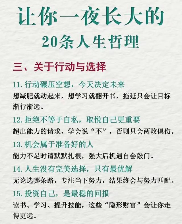 这段文字深刻而温暖,充满了对人生的感悟和哲理。以下是一些经典的人生哲理句子,句句走心,或许能带给你一些启示和共鸣:“年龄越大,越要懂得放下。”放下过去的包袱,才...