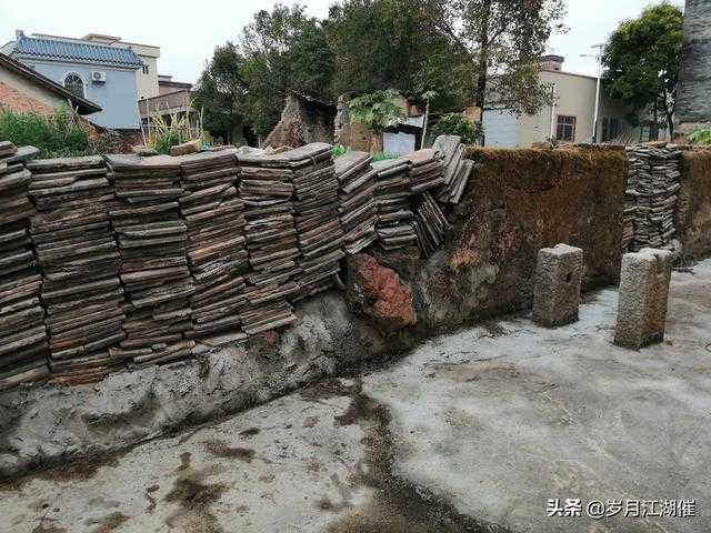 竖立着这两块石头原来是米椿遗留的,堆叠瓦片的另一边以前也是住人的老房子。