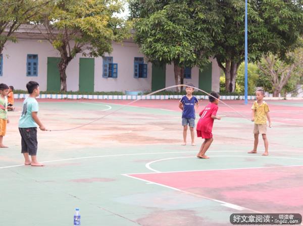 跳大绳游戏也很受欢迎。两个同学在两旁摇动大绳,摇绳的同学站稳脚跟,用力的摇起来,绳子上下翻飞,当绳子接触地面的时候,发出啪啪的声响。一个小朋友看准时机跳了进来,跟随着绳子摇动的频率上下跳动,只见这位小朋友身轻如燕,一口气跳了十多下。其他小朋友在隔壁看着忙拍手称好,他们也陆续加入跳大绳中。他们长绳之间穿梭着,鱼贯而入,一阵阵笑声在操场中央回荡着。