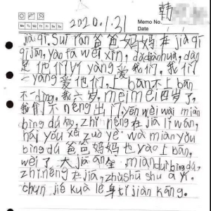 “近期,虽然爸爸妈妈在假期期间(要上班),(只能)要发微信,打电话,但是他们一样爱我们,我(和妹妹)一样爱他们,上班不上班不一定。我六岁,妹妹四岁了,我们不能出门,因为外面病毒多,只能在家里面,还有写 ...