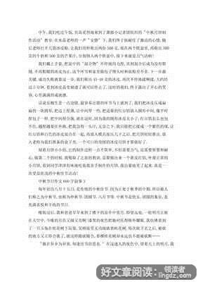 中国,是一个文明古国,有着悠久的历史,灿烂的文化,富饶的土地,自强不息的人民……当然,丰富的节日也是不可少的。有元旦、有春节、有中秋节、有国庆节等等。在这个收获满满的秋天,迎来了八月十五——中秋佳节。中秋的时候,晚上人们会吃月饼,会赏月,放孔明灯。