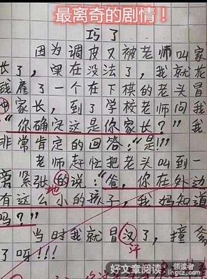 最突出的表现是选材的小儿科。很多孩子都是这样构思的:某某甲有个好习惯,所以顺利考上名牌,某某乙没有好习惯,所以,么也没考上。这还算正常的,有几个孩子竟然这么写的:某某习惯于几点上学,有次路上撞了车,司机拉他去医院,他坚决拒绝,理由是周一没有去医院的习惯。——很多这样不知所云的作文,让我不知该怎么打分。纯粹是错服了药的表现了。