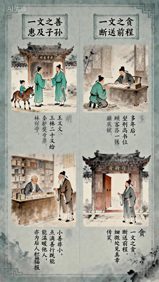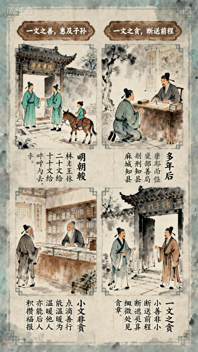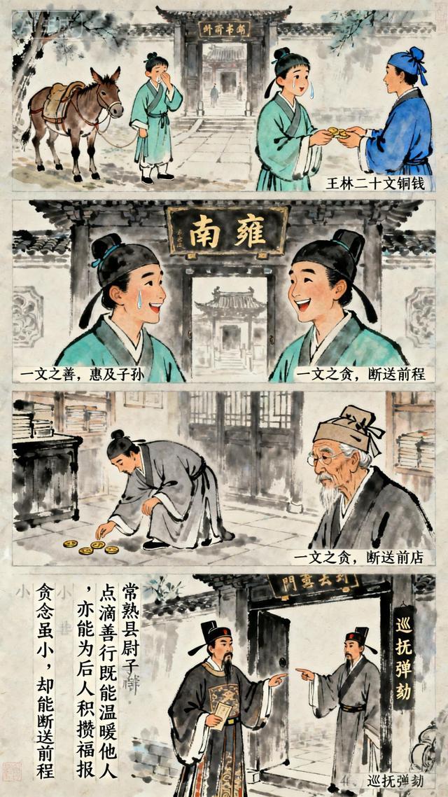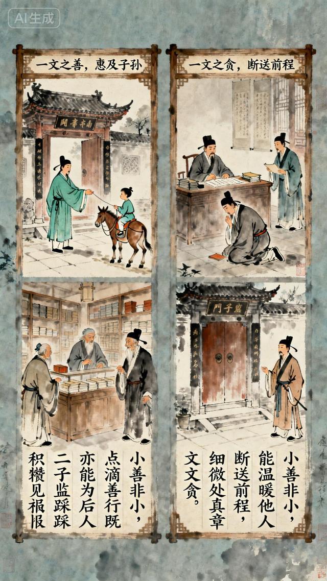 国子监生大惊,急忙追问弹劾缘由,门子告知是“贪”。他满腹委屈,争辩自己尚未到任,何来贪腐之说,执意站在门口不肯离去。门子再次入内禀报,回来后传话:“你当年在书店,为了一文钱便耍小聪明占为己有,这般心性,若做了地方官,岂不是要成戴纱帽的强盗?”