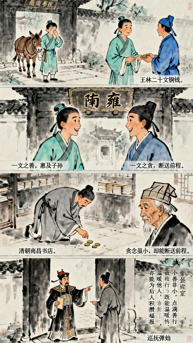 清朝南昌有个国子监生,因父亲是国子监学官,得以入国子监读书。一日他逛书店,见有顾客掉落一文钱却浑然不觉,便悄悄将钱踩在脚下,待失主离开后,才俯身捡起揣入怀中。